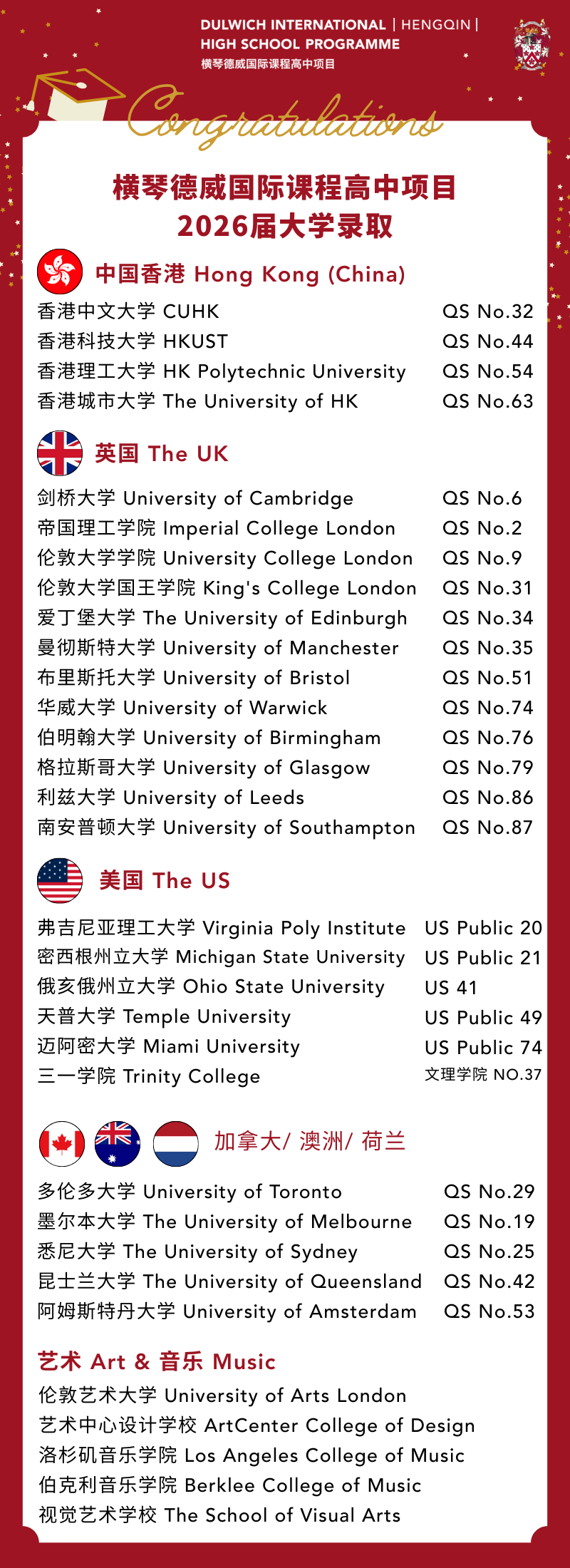 截至1月30日,橫琴德威國際課程高中項目(以下簡稱“橫琴德威”)2026屆畢業生的錄取喜報紛至沓來,錄取涵蓋全球多所高校,其中包括: