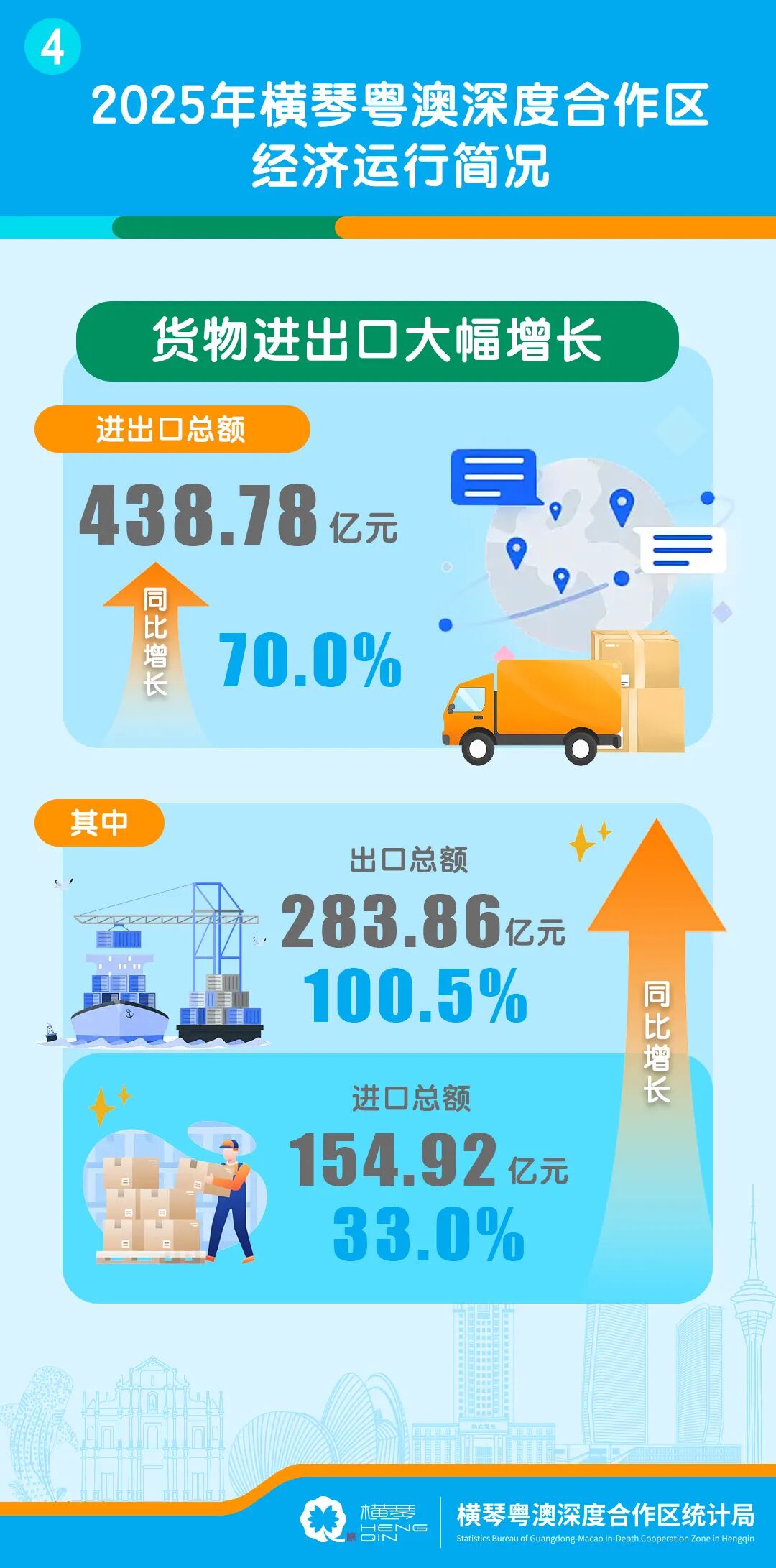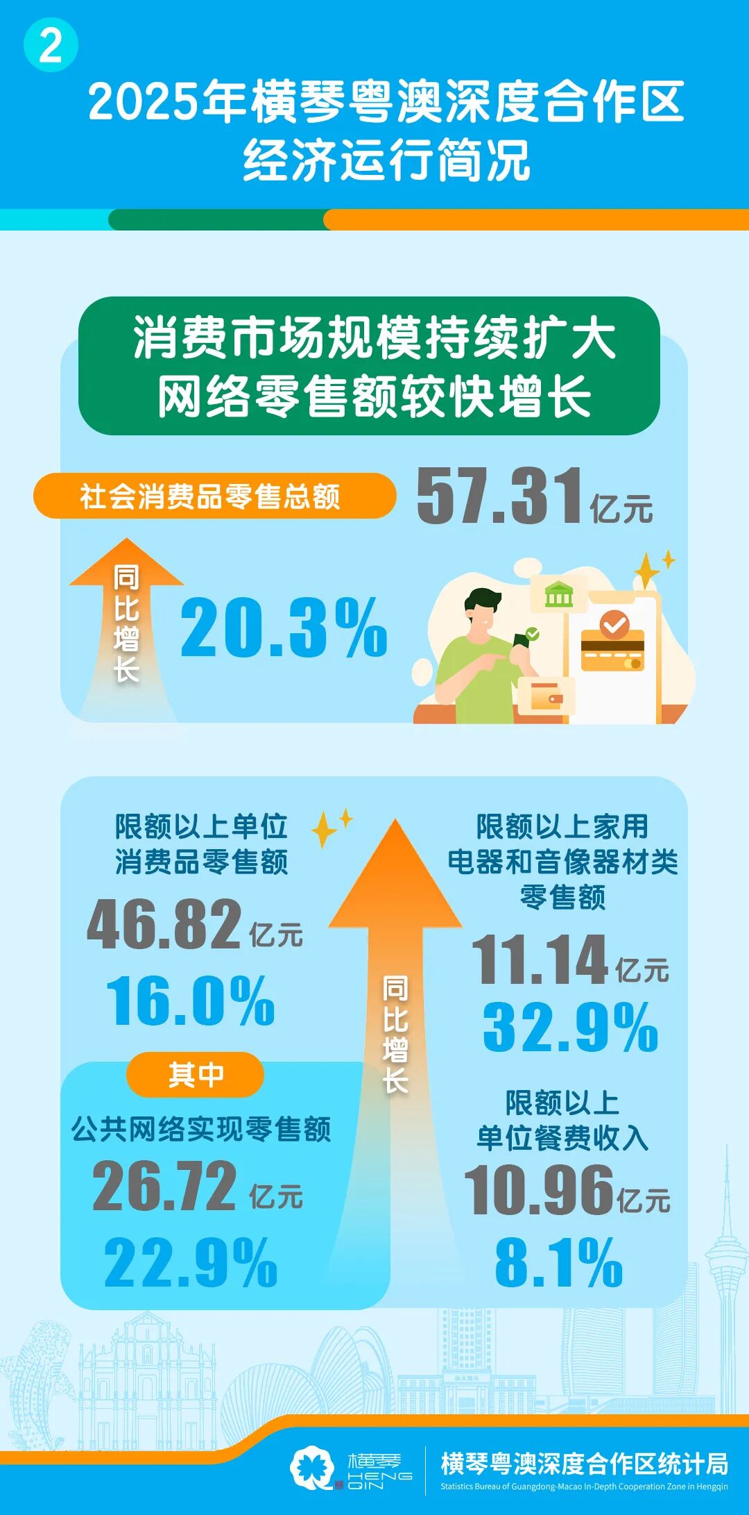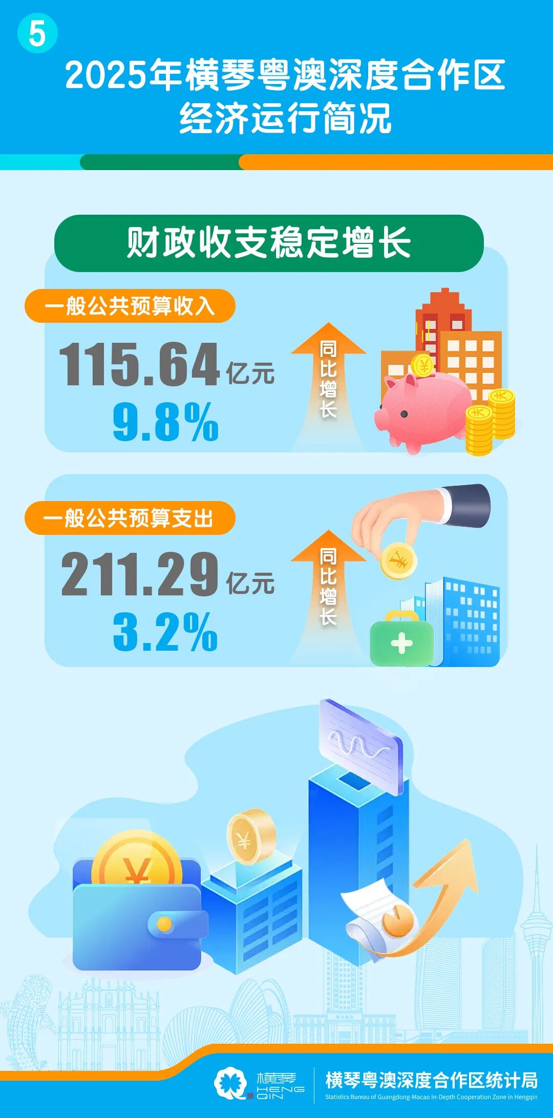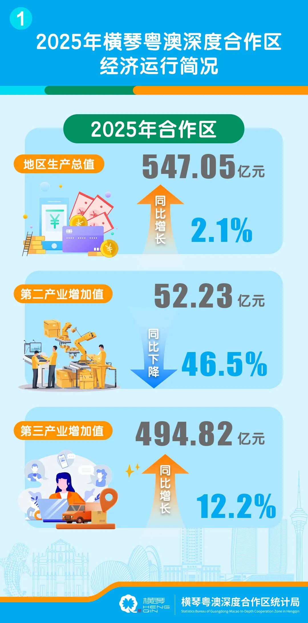 2025年,橫琴全年主要經濟指標平穩運行,部分經濟指標實現較快增長。根據地區生產總值初步統一核算結果,2025年合作區實現地區生產總值(GDP)547.05億元,按不變價格計算,同比增長2.1%,詳情如下。