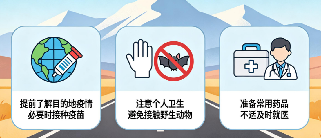 在旅行過程中,要注意個人衛生,避免接觸野生動物。同時,需準備好常用藥品,若身體出現不適症狀,應及時就醫。
