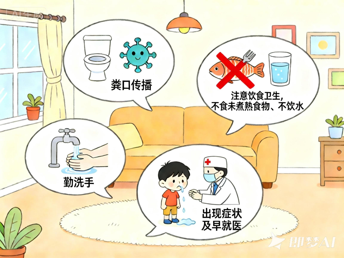 對於患者的嘔吐物和排泄物,需使用含氯消毒劑進行處理,患者應居家隔離,直至症狀消失後至少三天,儘量避免接觸易感人群。