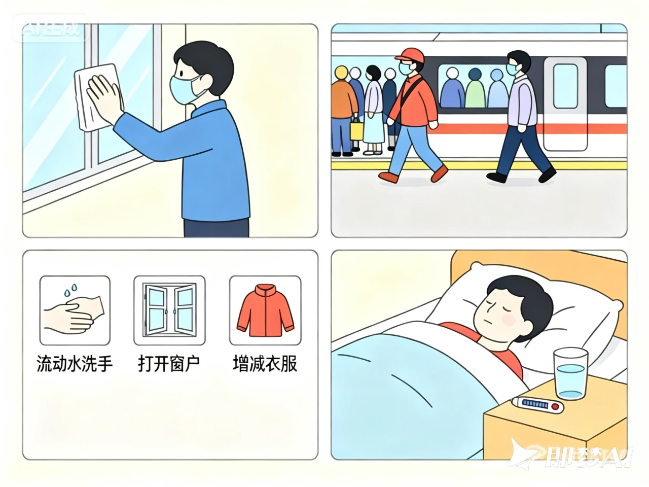 年末進行大掃除時,應佩戴口罩以防止黴菌進入呼吸道;春運期間,在人員密集場所建議佩戴口罩;勤洗手,常開窗通風,適時增減衣物以預防感冒。