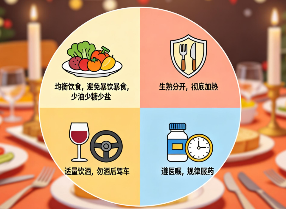 節日期間聚餐頻繁,應保持均衡的飲食結構,避免暴飲暴食和過量飲酒。要特別注重食品安全,慢性病患者需嚴格遵醫囑服藥。