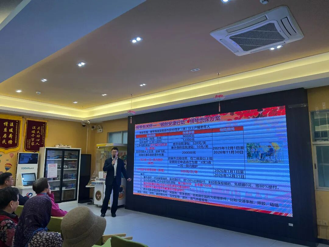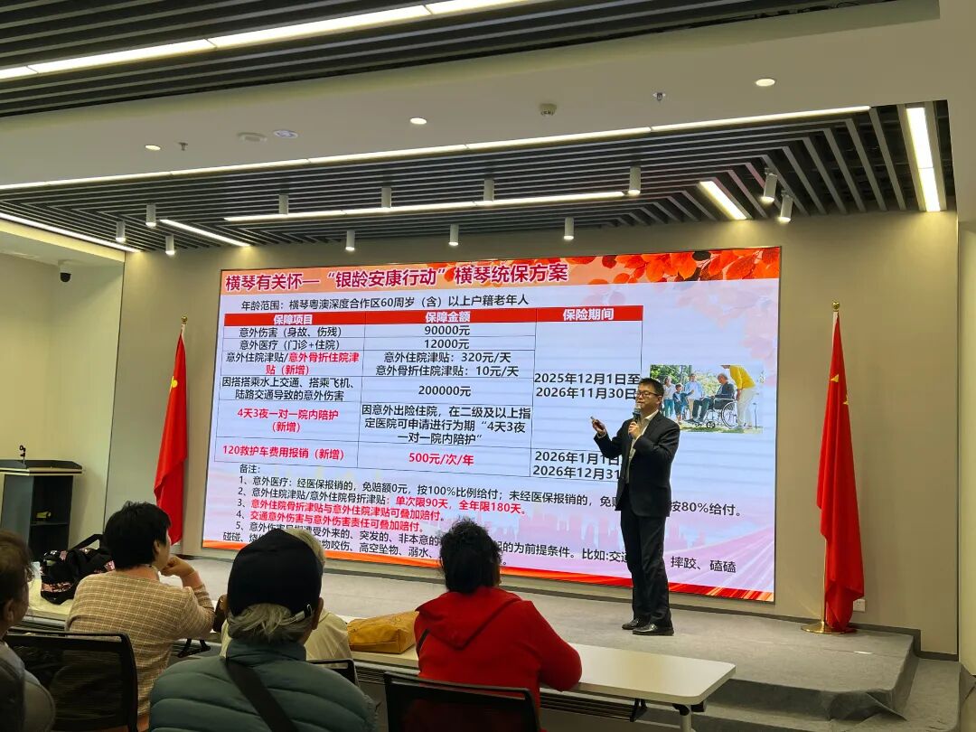 2025年12月,“樂享銀齡·悅在社區”主題系列活動先後走進合作區小橫琴、新家園、荷塘和蓮花四個社區,中國人壽保險股份有限公司珠海分公司工作人員爲長者解讀2025—2026年度老年人意外傷害綜合保險政策,用通俗語言拆解保障細節,讓長者們聽得懂、記得牢、用得上,還爲每位到場長者逐一發放保單憑證,切實打通服務長者的“最後一米”。