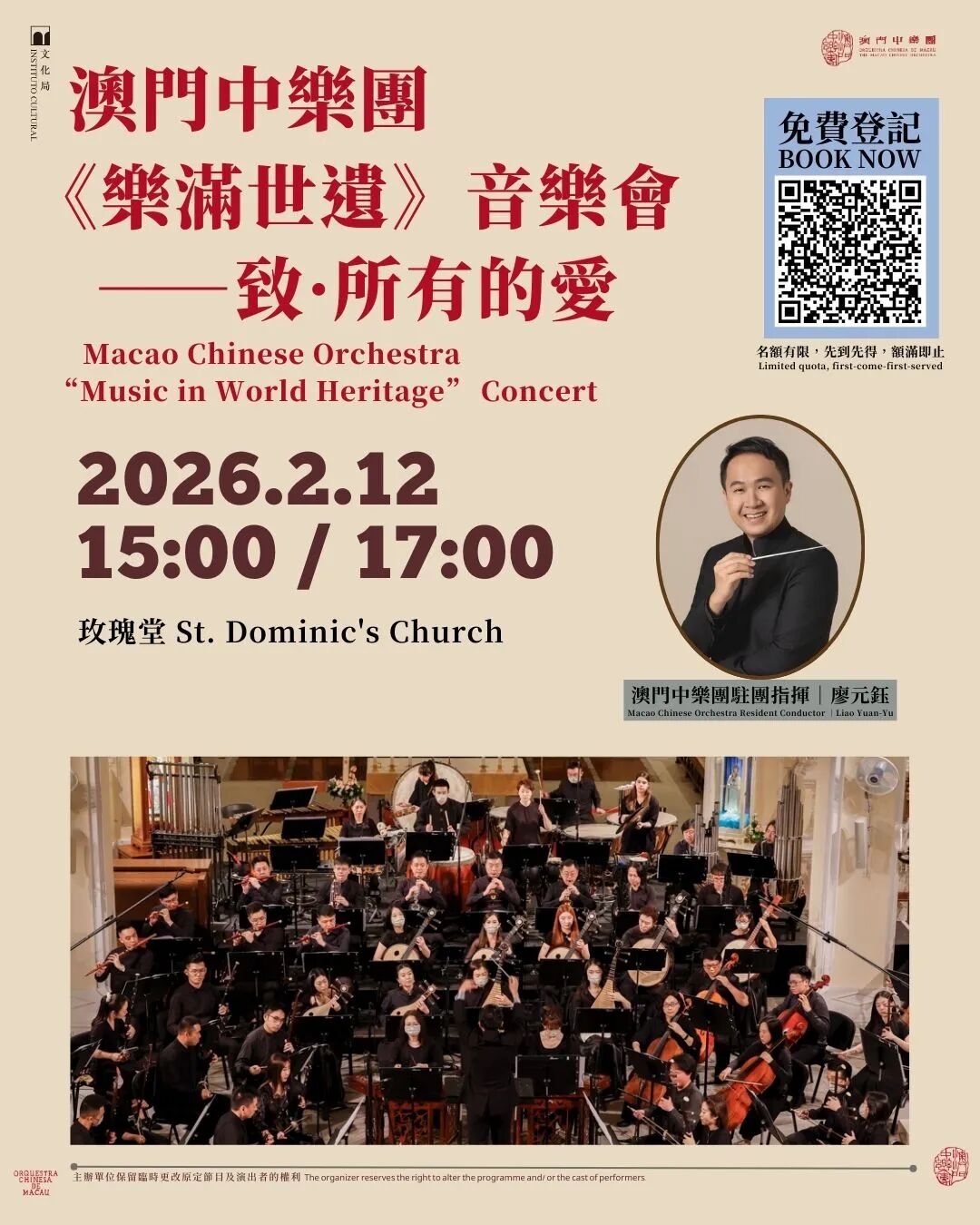 澳門特區政府文化局將於2月12日15:00及17:00在玫瑰堂上演《樂滿世遺》,由澳門中樂團帶來多首洋溢節日氣氛的音樂佳作,藉歷史建築與音樂藝術融合的演出,爲節日增添美好回憶。