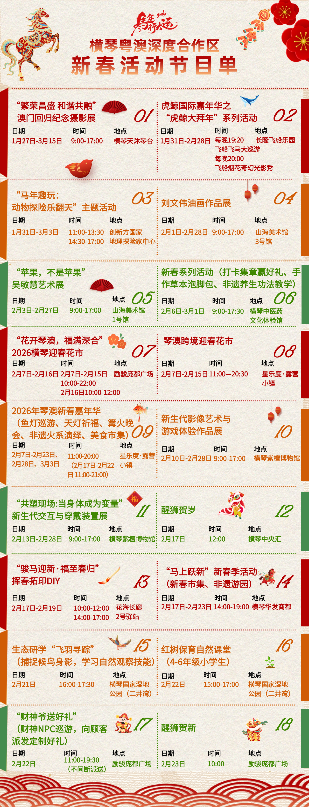 辭舊迎新之際,誠邀琴澳居民及各地遊客共赴一場兼具傳統底蘊與國際風采的新春之約,攜手在和諧共融的氛圍中開啓一個福氣盈門、萬象更新的錦繡新年。