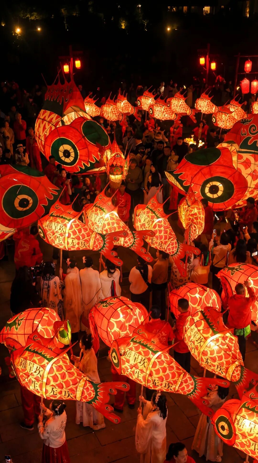 傳承百年的5米巨型吉祥魚燈領銜巡遊,遊客可現場體驗手工製作魚燈,並免費領取孔明燈放飛心願。非遺火系表演更爲特色,1600攝氏度的鐵水化作漫天火花,國家級的非遺打鐵花表演以火爲筆驅邪納吉。