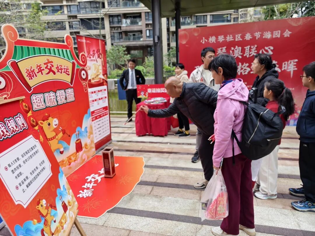 1月末的暖場活動就已經氛圍感十足:小橫琴社區8個網格同步開啓遊園會,揮春送福、投壺納福的攤位前排起長隊,生菜派送的“生財”彩頭讓大家笑眯了眼;新家園社區的義賣活動裏,七巧板拼小馬、歇後語對對碰的互動,搭配暖心手作,把善意藏進了每一份新春祝福中。