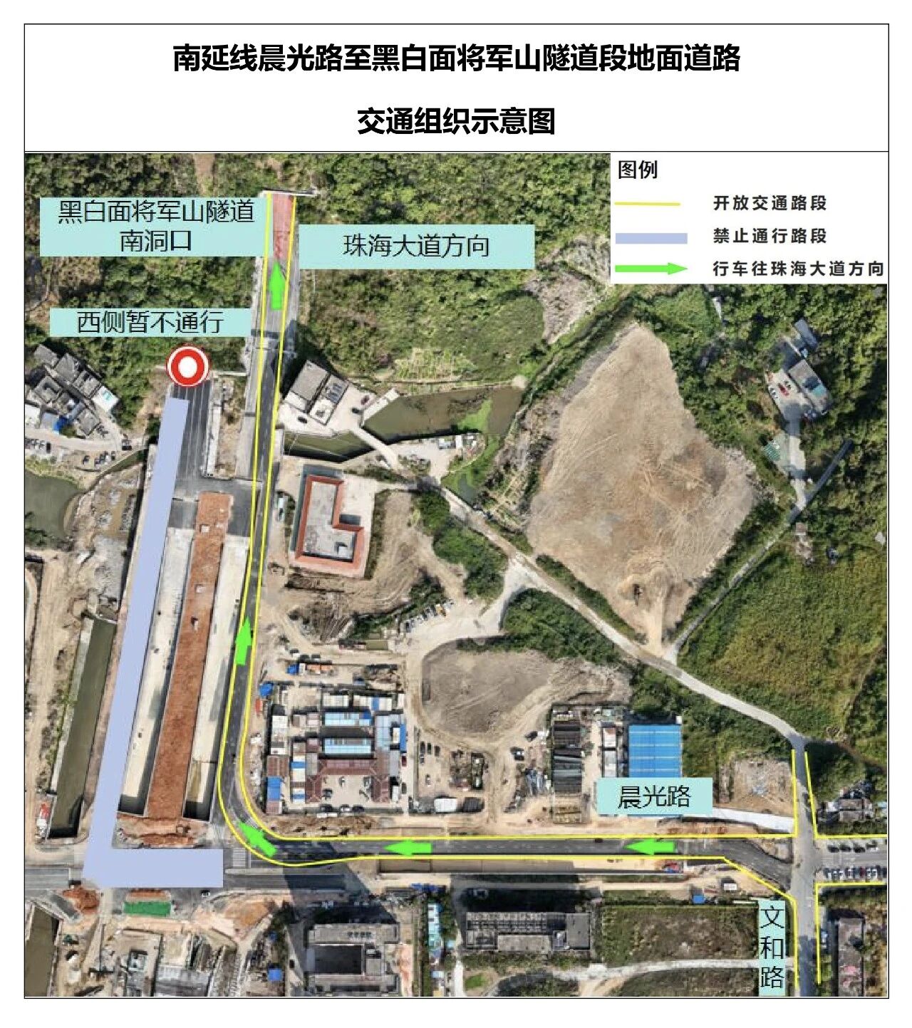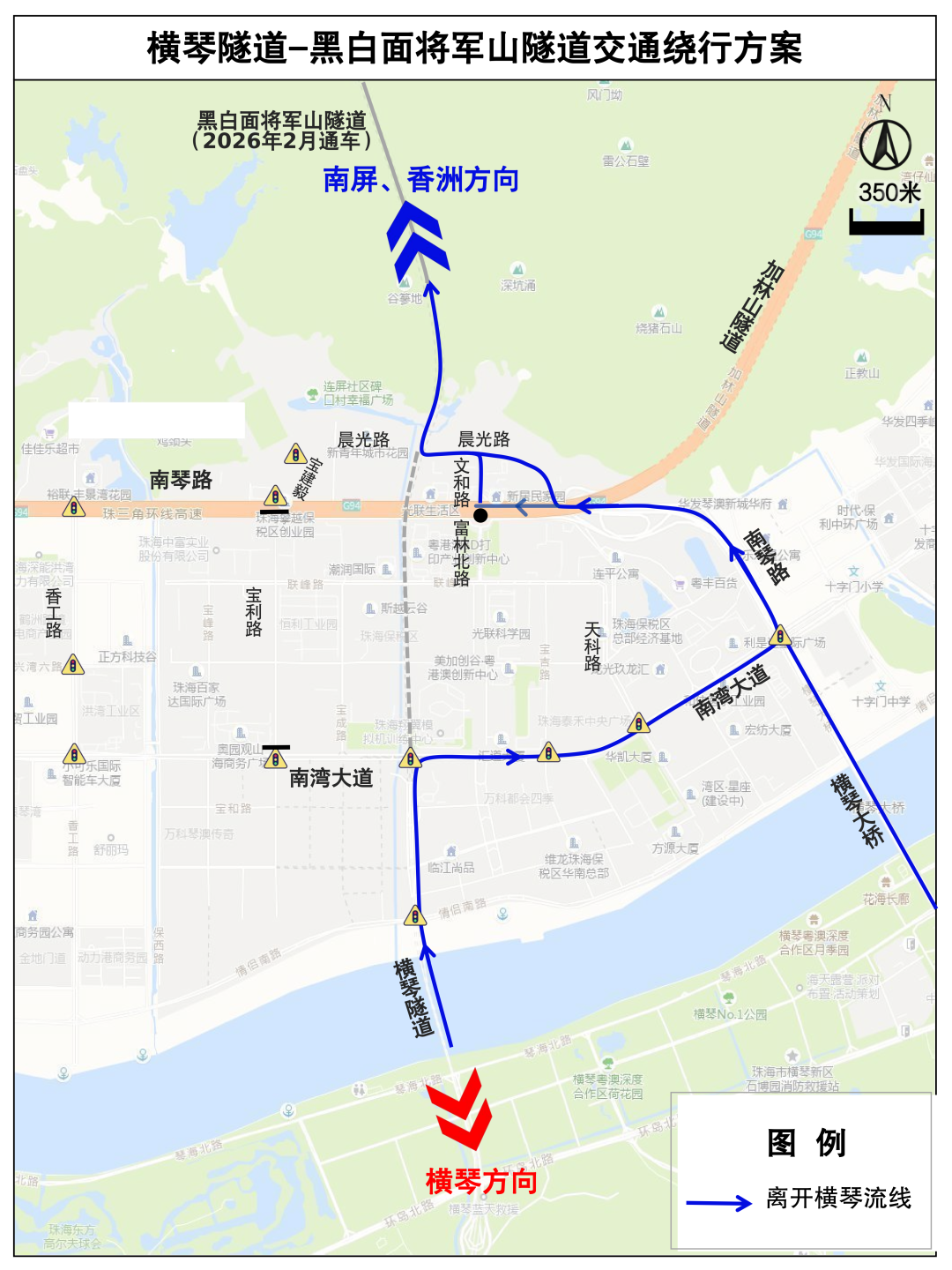 黑白麪將軍山隧道至香海大橋新建工程(一期)南往東匝道、橫琴隧道至黑白麪將軍山隧道新建工程(晨光路至黑白麪將軍山段),於2026年2月15日上午10時,正式啓動單向試通車。