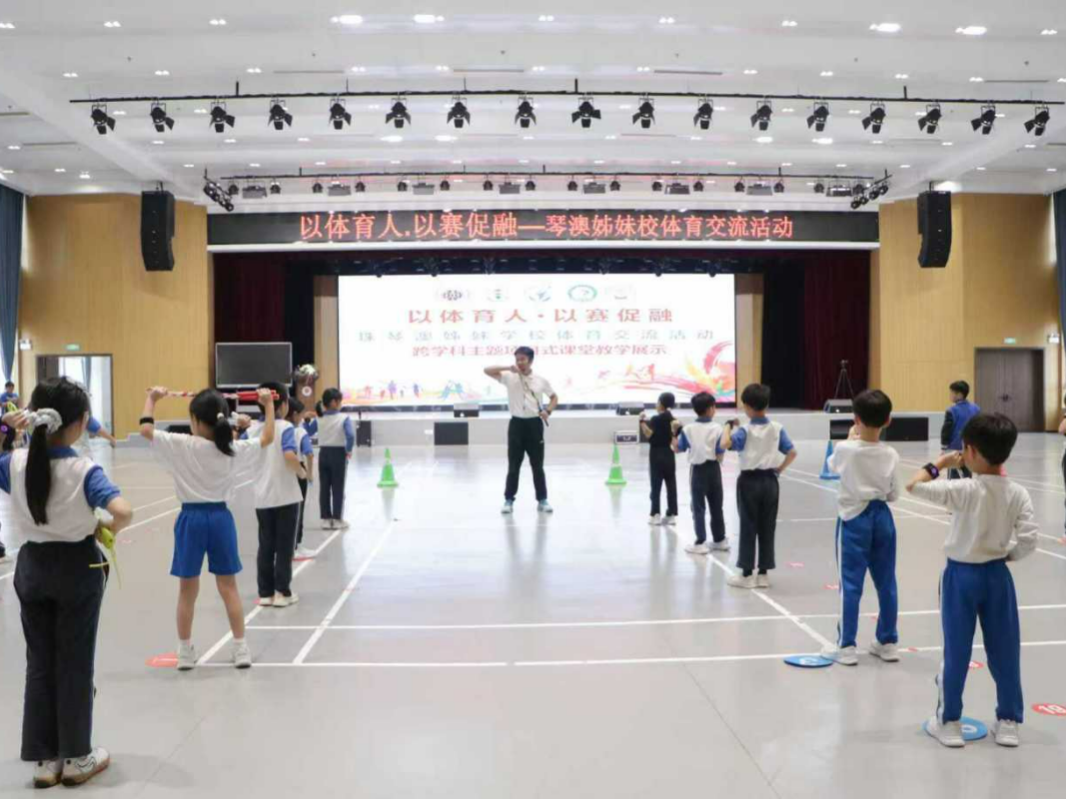 2024年11月18日,橫琴子期小學第三屆運動會上,200多位澳門師生參與其中。開幕式上,56名身着各民族服飾的學生簇擁五星紅旗前行,橫琴子期小學、澳門浸信中學和澳門培正中學的學生代表共同領唱《歌唱祖國》。澳門培正中學學生還帶來了融合葡萄牙土風舞的表演。兩地學子同場競技,在運動中增進友誼,成爲琴澳教育融合的生動實踐。