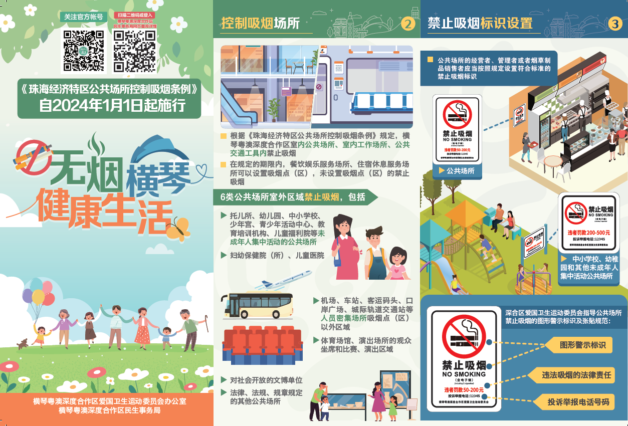 《珠海經濟特區公共場所控制吸煙條例》(以下簡稱《條例》)已於2024年1月1日起施行,旨在減少吸煙造成的危害,保障公衆健康,創造良好的工作和生活環境,提高城市文明水平。橫琴粵澳深度合作區積極打造“無煙橫琴”,不僅是城市文明象徵,更是守護琴澳居民和遊客健康的重要保障。在此,我們號召琴澳居民、商戶及遊客共同學習遵守《條例》,攜手創建“無煙橫琴”。