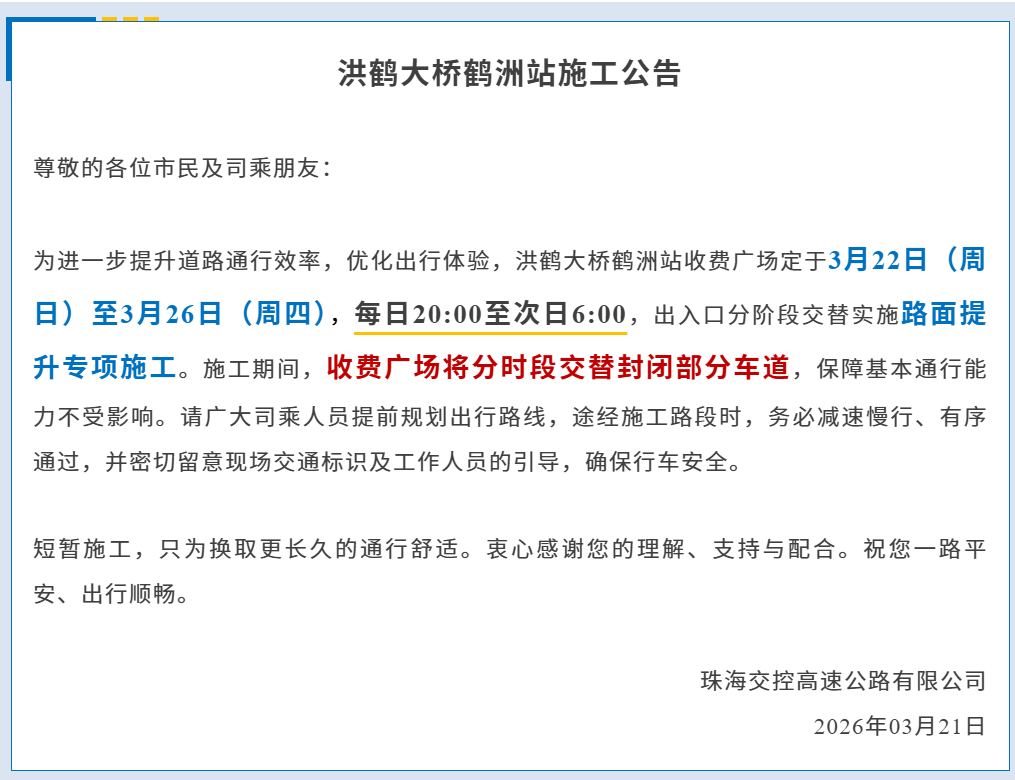 爲進一步提升大家的出行體驗,洪鶴大橋鶴洲站收費廣場於3月22日—26日進行路面提升專項施工。施工期間,收費廣場將分時段交替封閉部分車道。具體公告如下: