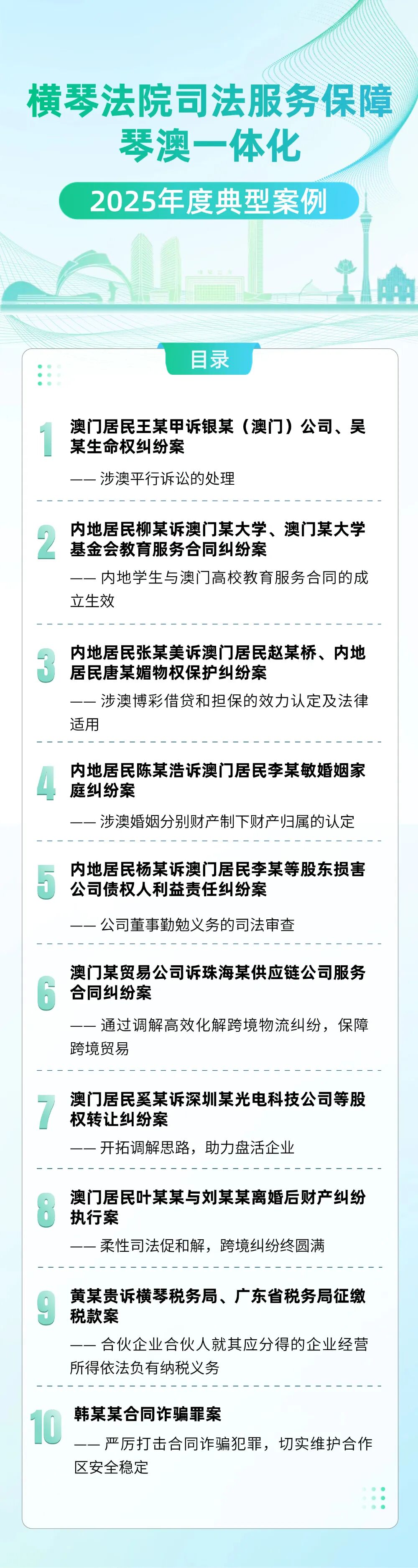 近日,橫琴粵澳深度合作區人民法院發佈司法服務保障琴澳一體化2025年度典型案例。此次發佈的10個典型案例,涵蓋涉澳平行訴訟、稅收徵繳、高校教育、婚姻家庭、物權保護、公司董事義務、合同詐騙等多個領域,集中展現了橫琴法院錨定“澳門+橫琴”戰略定位,在服務保障合作區發展大局、推動琴澳司法規則銜接、機制對接方面的生動實踐和最新成果。
