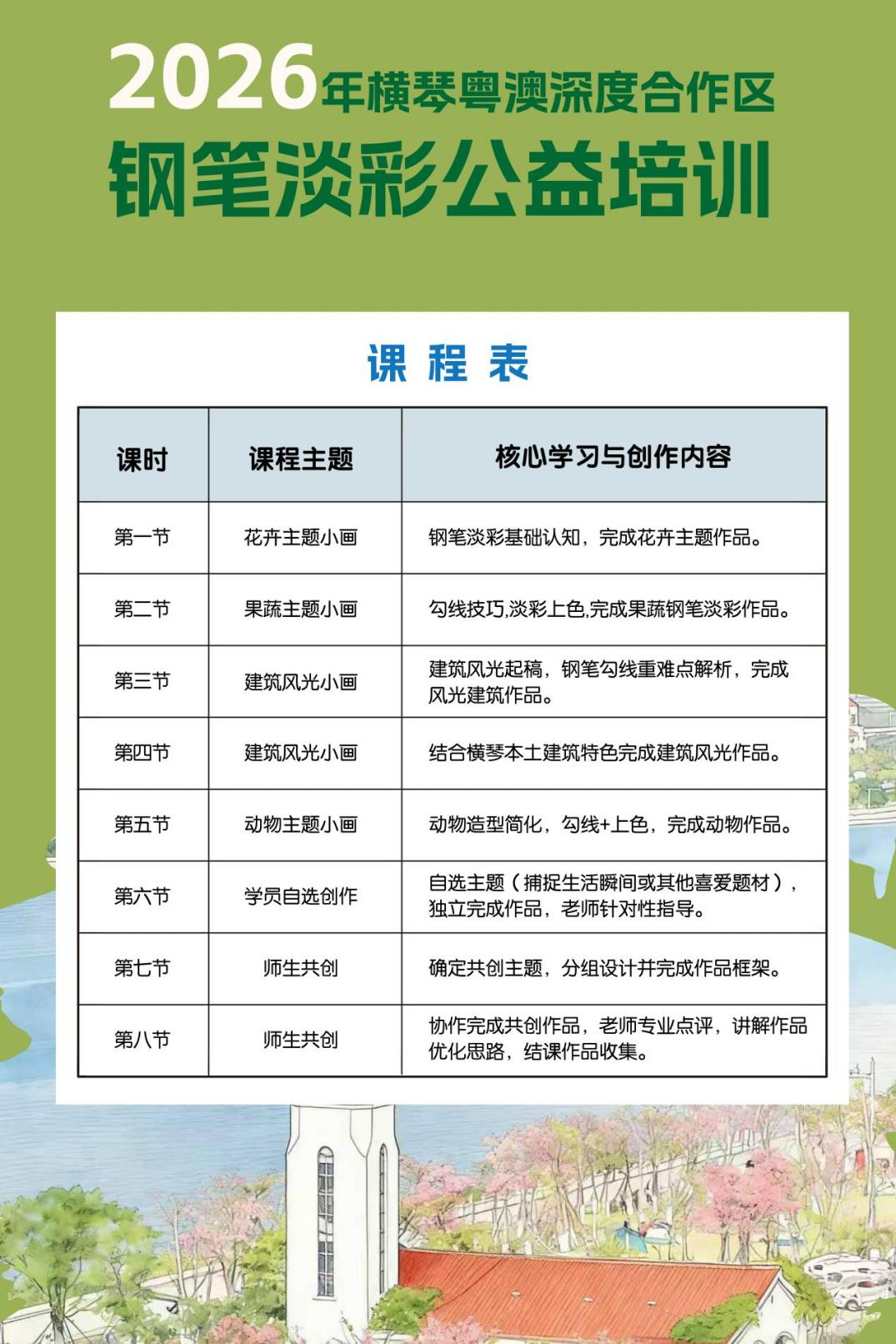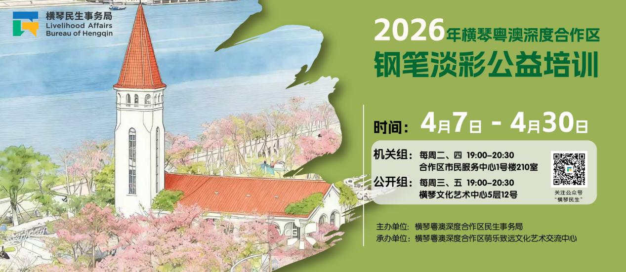 爲持續提供高質量公共文化服務,由合作區民生事務局主辦的2026年橫琴粵澳深度合作區鋼筆淡彩公益培訓即日起開始報名。