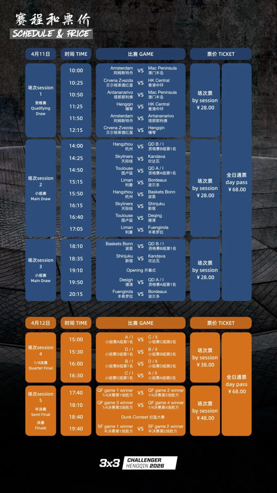 本次賽事秉持親民惠民理念,推出低票價政策,讓更多籃球愛好者能近距離感受國際頂級三人籃球賽事的魅力,具體票價信息如下。