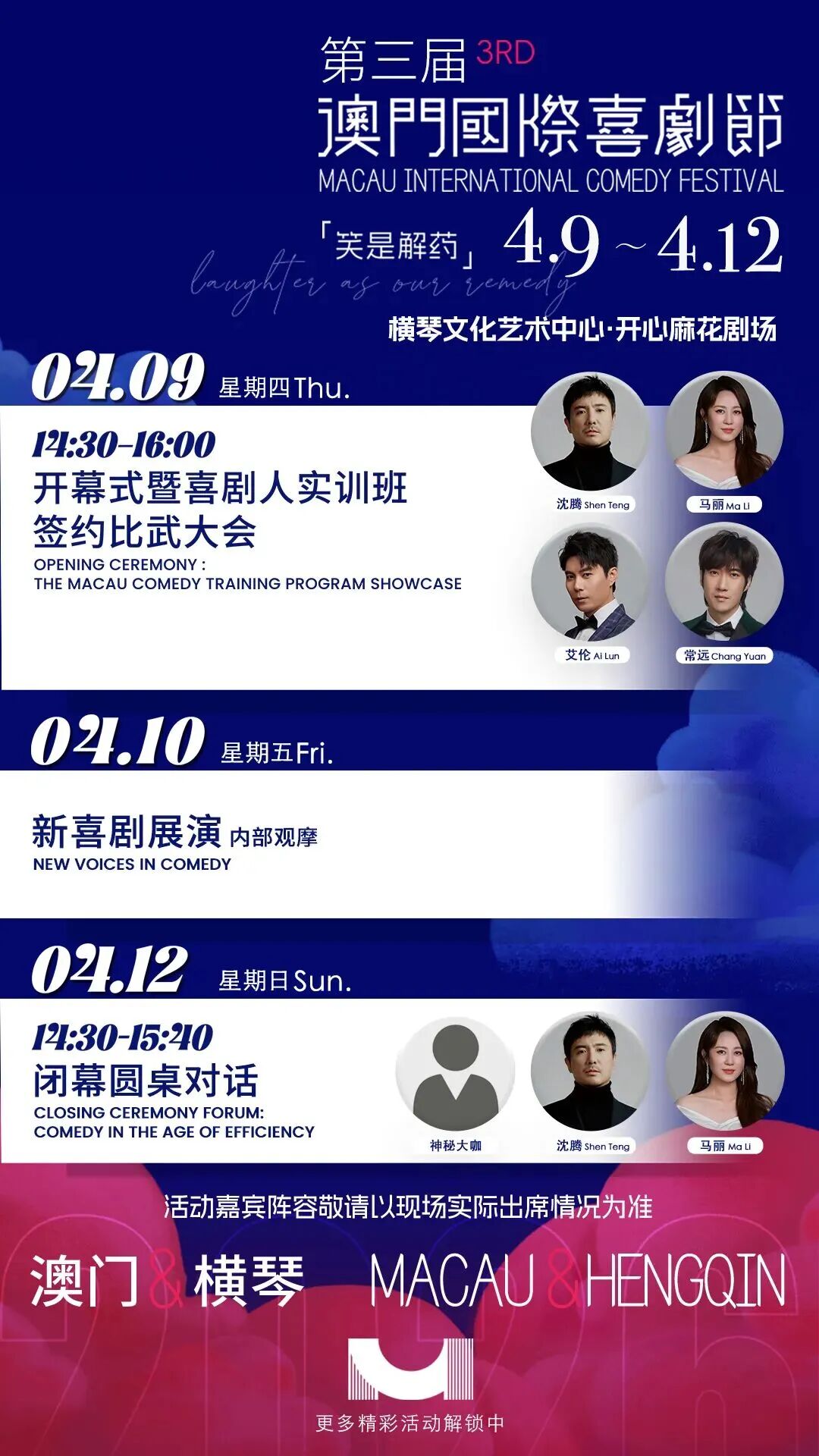與此同時,第三屆澳門國際喜劇節同期盛大啓幕,4月9日至4月12日於澳門、橫琴兩地開啓四天歡樂旅程。