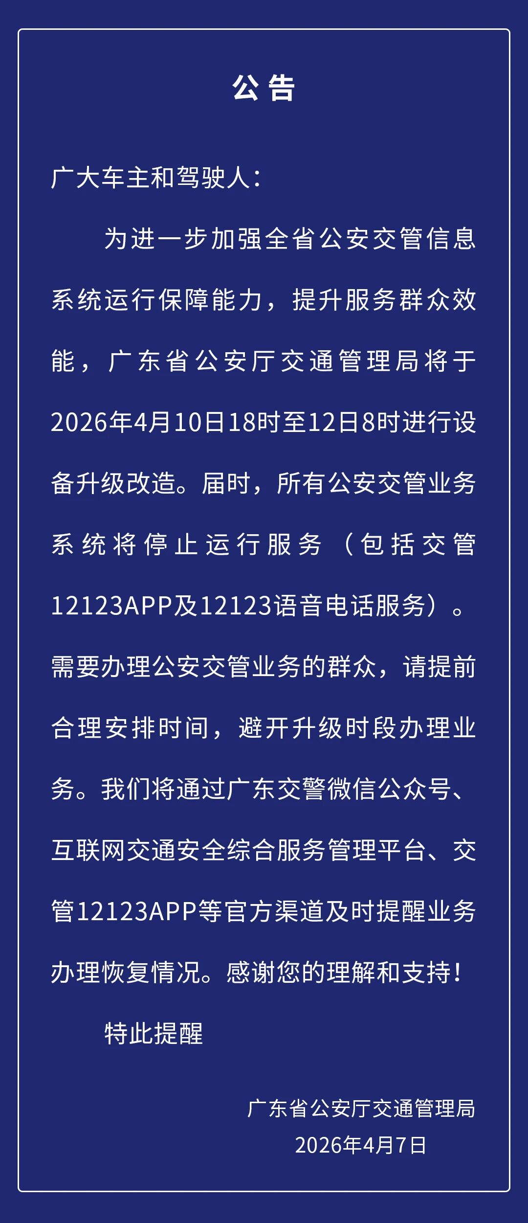 據悉,爲進一步加強全省公安交管信息系統運行保障能力,提升服務群眾效能,廣東省公安廳交通管理局將於2026年4月10日18時至12日8時進行設備升級改造。