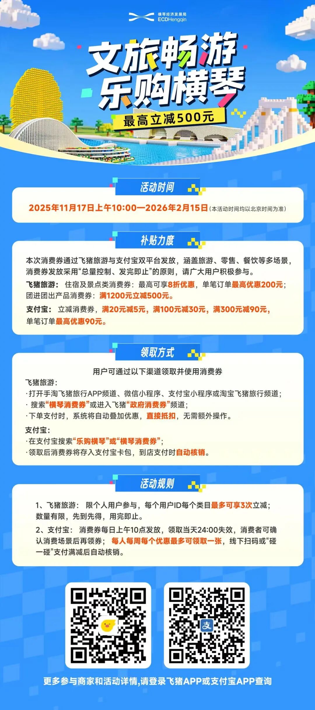 “文旅暢遊·樂購橫琴”消費券活動即日起正式啓動,活動將持續到明年2月15日。從2025年11月17日開始,每天上午10點起,消費者均可通過“飛豬旅遊”APP或“支付寶”APP領取消費券,最高可優惠500元,名額有限,領完即止。