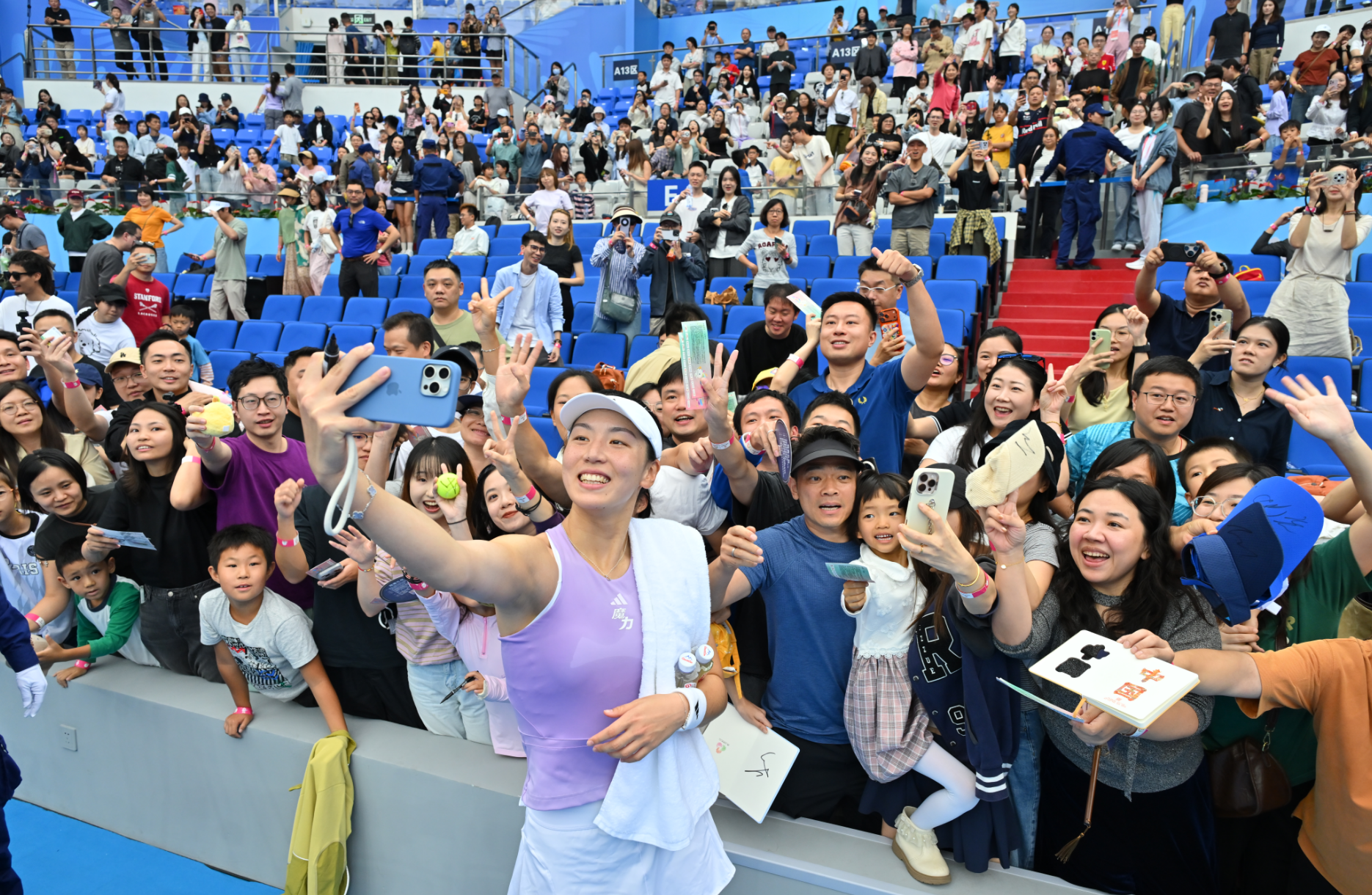 1號場地比賽結束後,以2:0取勝的王雅繁並沒有立刻離場,而是留下來簽名、合影,與觀衆互動了近十分鐘。網球愛好者陳女士便是其中一員。2023年底,她曾在同一片場地看過珠海女子網球選手協會(WTA)超級精英賽。