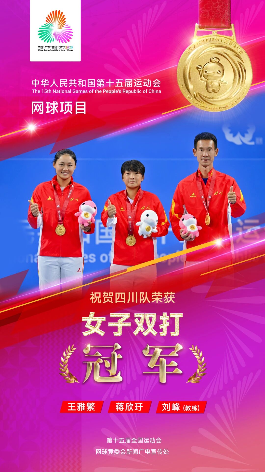 唐盛/孫淺、王雅繁/蔣欣玗 分別奪得十五運會網球男雙、女雙金牌