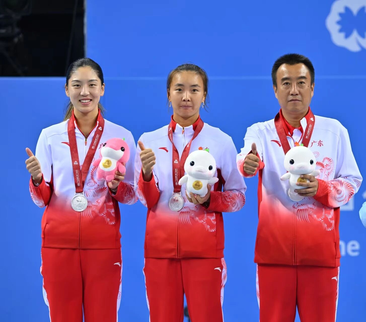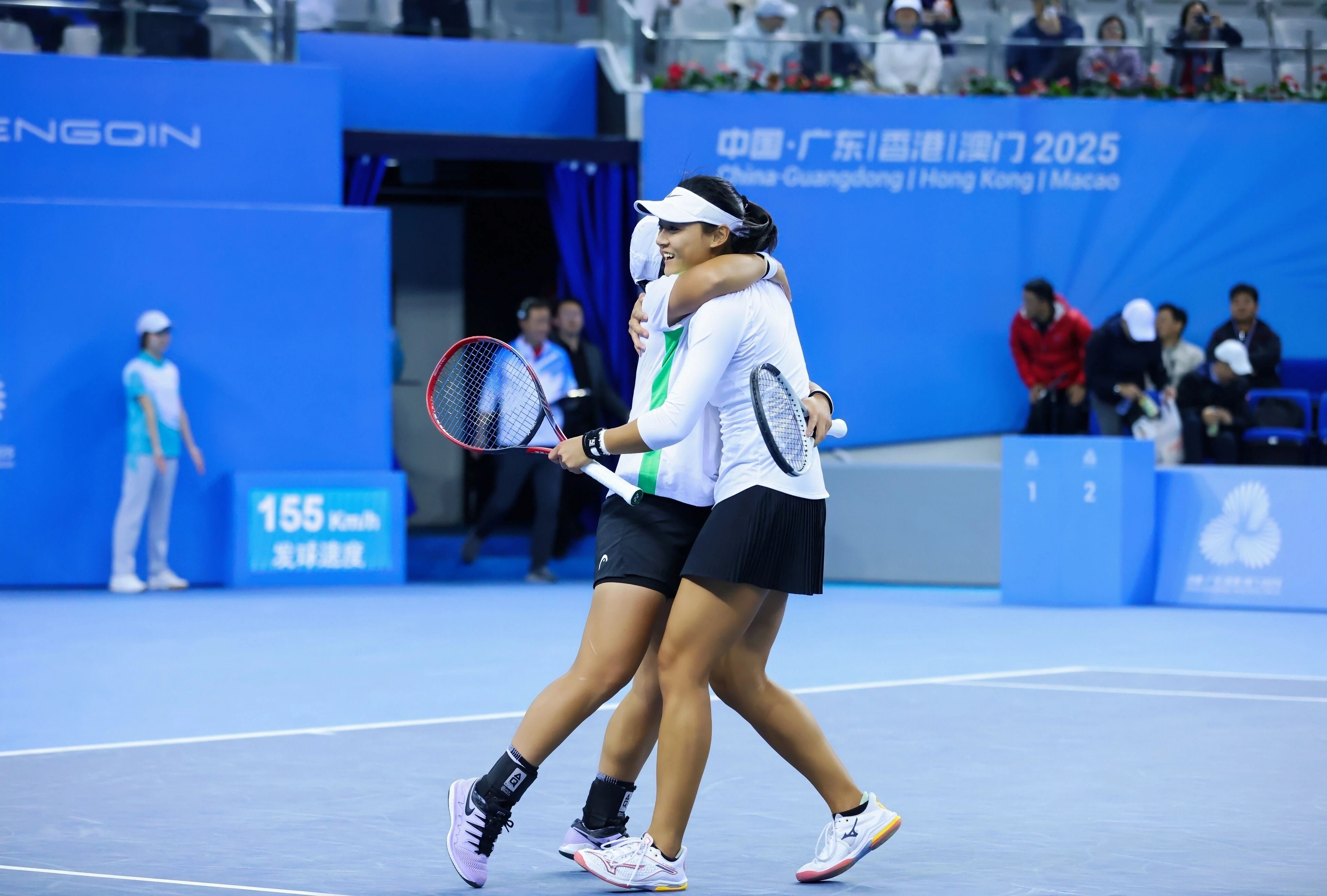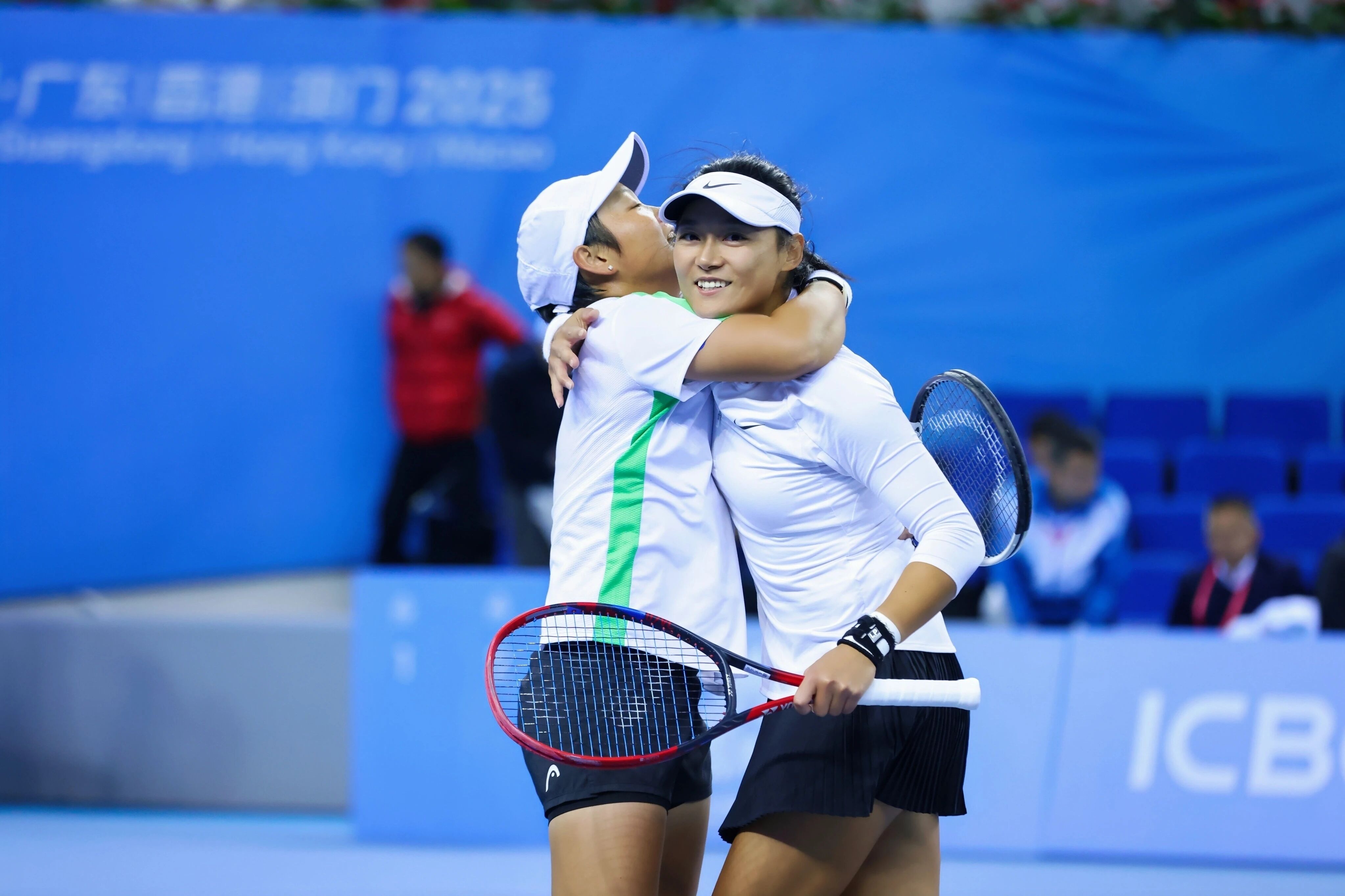 上屆全運會上,王雅繁/蔣欣玗獲得了女雙銀牌,這一次在橫琴,在十五運會的舞臺上,兩人終於奪得了這枚寶貴的全運會女雙金牌,賽後兩人非常激動,緊緊擁抱在了一起。王欣瑜在本屆全運會上則獲得了女雙銀牌、女單銅牌一共兩枚獎牌。