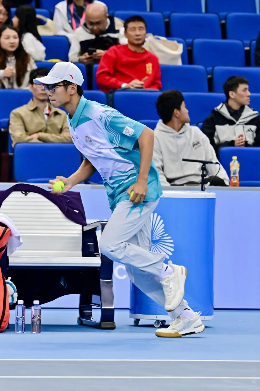 在19日的男單半決賽中,一記網球不慎飛出場外。陳宇涵迅速翻越場邊圍欄,向在場觀衆取回球,待該回合結束後立即返回場內,將球精準傳遞給運動員,全程並未影響比賽節奏。“我們是保障賽事順暢運轉的‘螺絲釘’,雖然不在聚光燈下,但每一個細節都不能馬虎。”陳宇涵說。