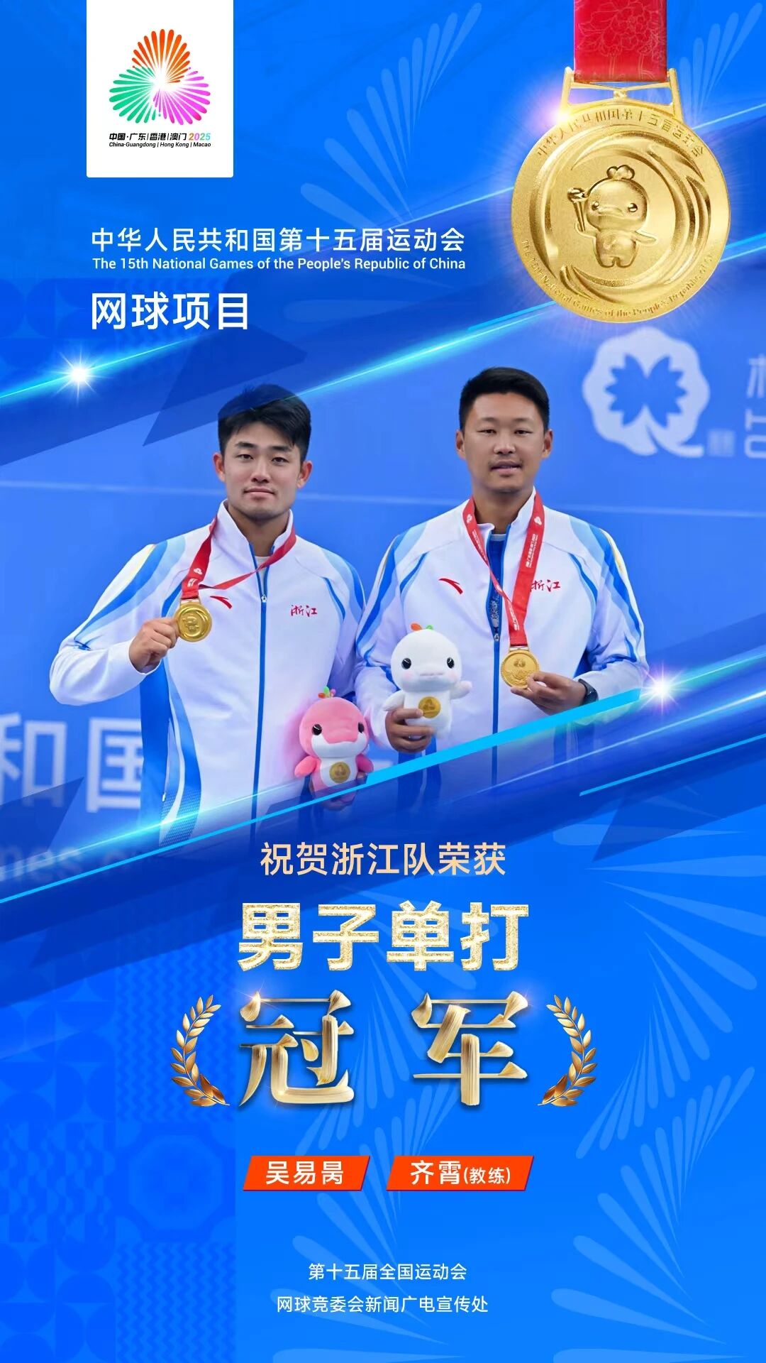 11月20日,十五運會網球比賽在橫琴國際網球中心進入最後一個比賽日的爭奪。男單決賽上演一場強強對話,最終浙江選手吳易昺6:0、1:6、6:4擊敗北京選手商竣程,首奪全運會單打金牌。商竣程收穫銀牌,廣西選手周意、香港選手黃澤林獲得銅牌。
