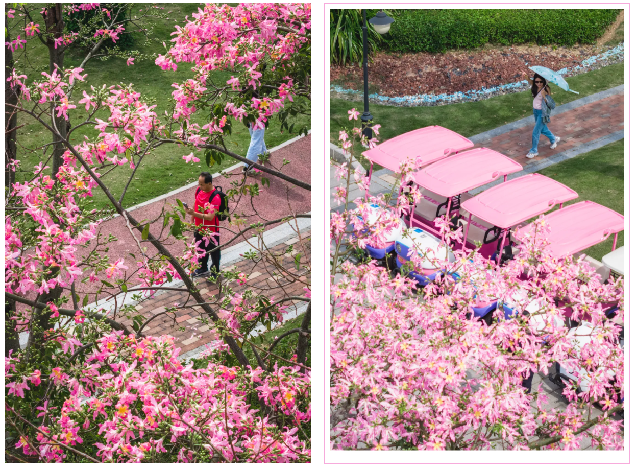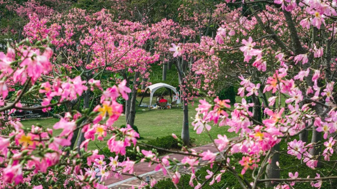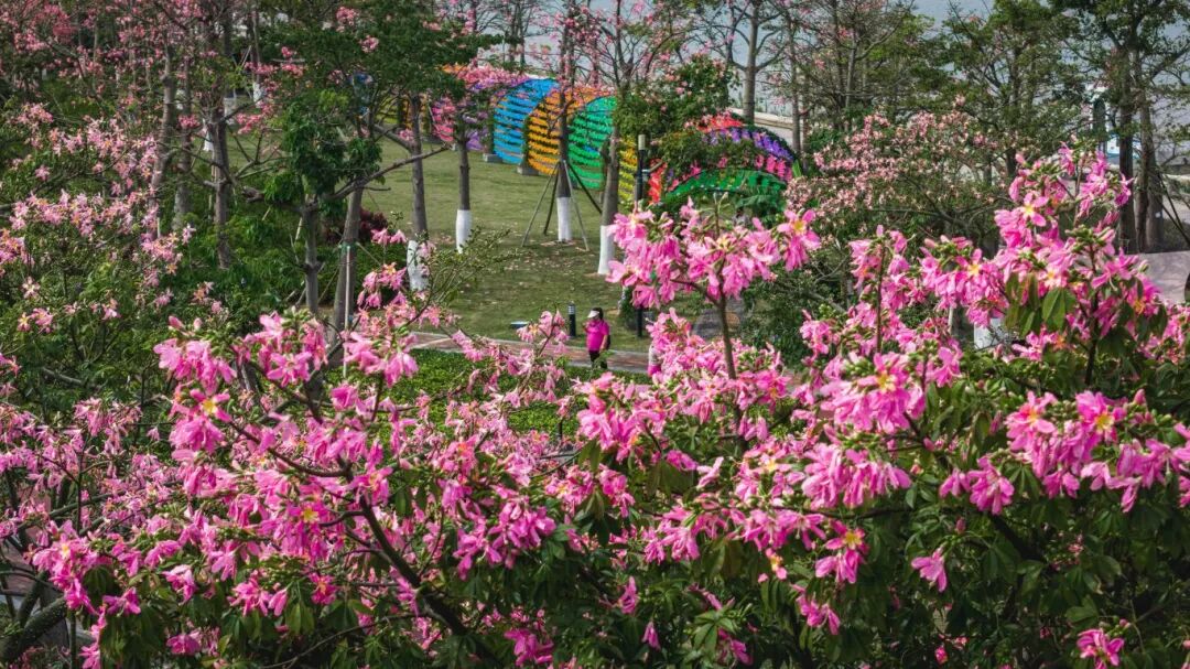 數千株美麗異木棉正開得熱鬧,粉色的花朵掛滿枝頭,把橫琴的冬天裝點得格外溫柔。