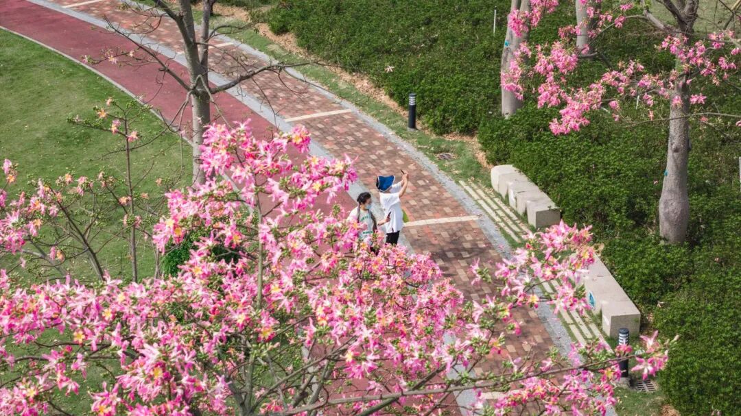 在這裏,每個人都能找到心儀的賞花方式。你可以沿着花海綠道悠然漫步,一擡頭,便能看見花朵如天邊傾瀉的雲霞。