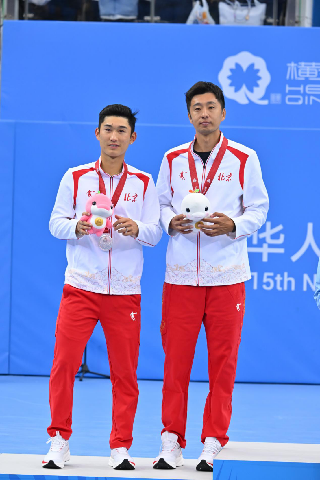 ▲北京隊隊員商竣程和男隊主教練王楚涵