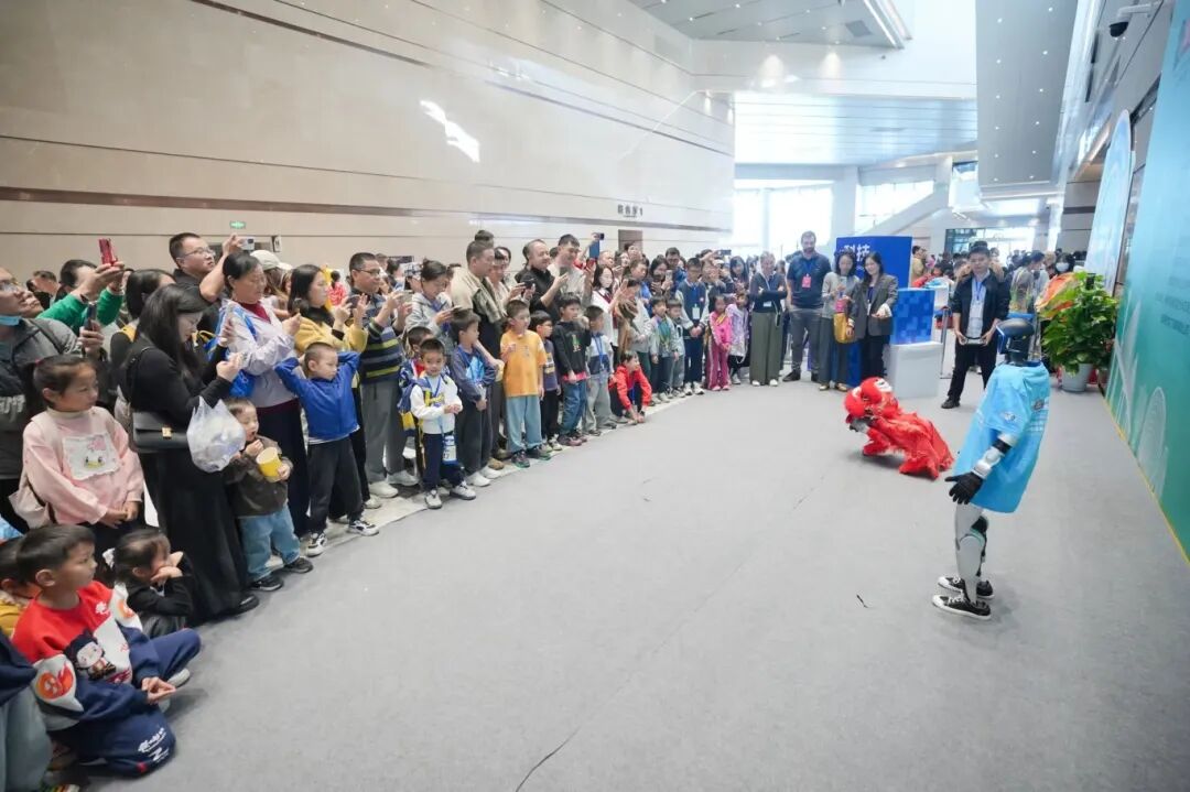 在“春晚同款機器人”展區前,觀衆們排起了長隊,想要與這個溫暖的“小夥伴”握手合影。而旁邊的機器狗則繼續帶領着孩子們逛展區,做專屬“小導遊”,引得衆人駐足圍觀。