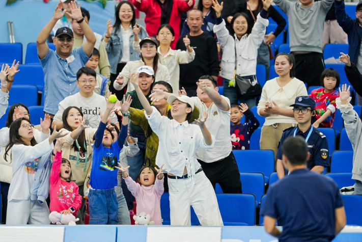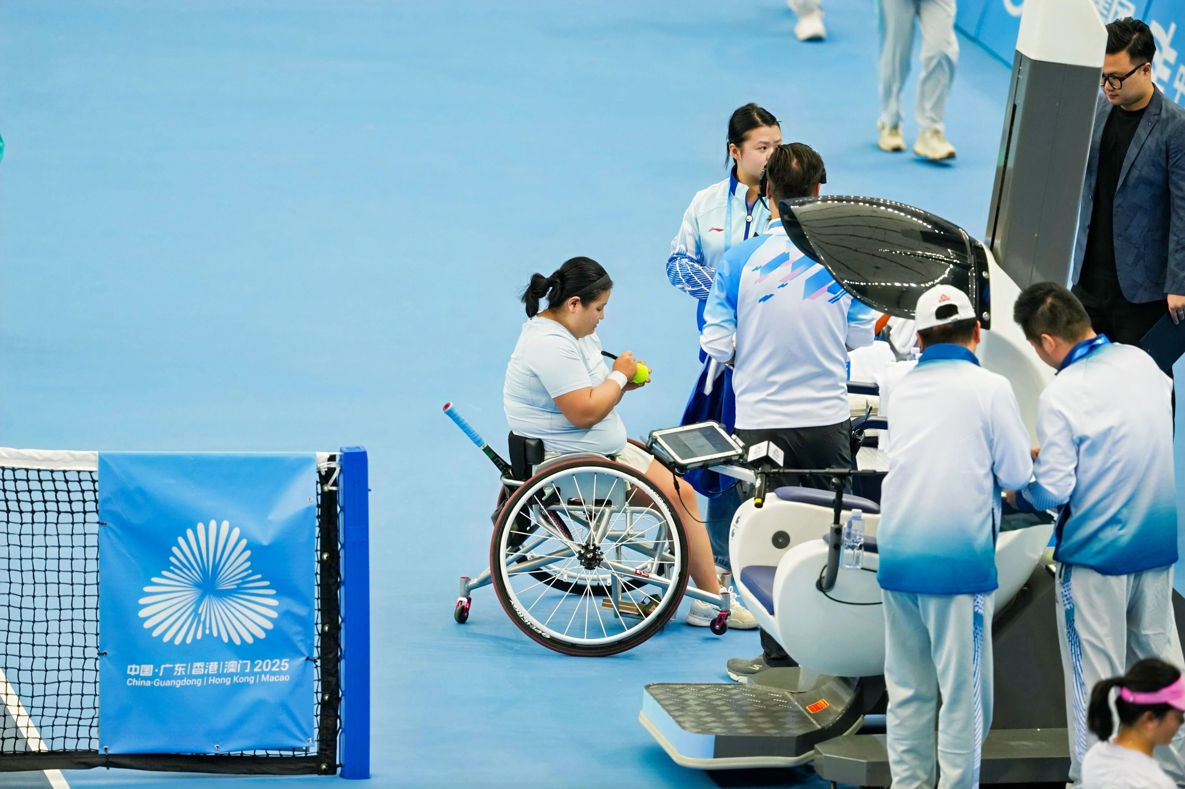 巴黎殘奧會銅牌、大滿貫單雙打冠軍得主王紫瑩的亮相備受關注。上午9時,代表四川隊出戰輪椅女團比賽的王紫瑩在中心球場率先登場,迎來自己在橫琴的首秀,最終她以4:1、4:0擊敗廣東一團的黃金鍊。