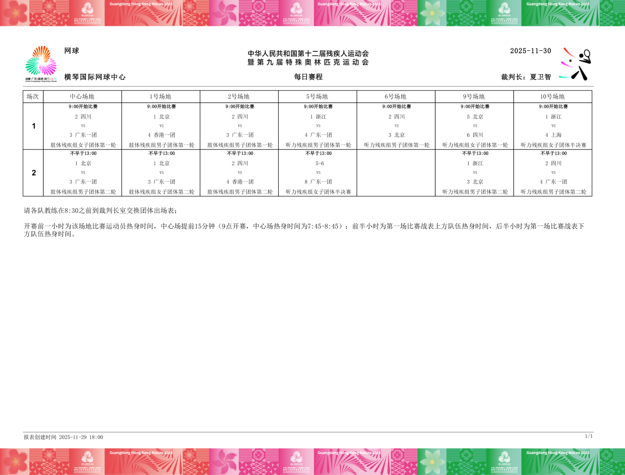 中華人民共和國第十二屆殘疾人運動會暨第九屆特殊奧林匹克運動會網球項目於11月30日至12月4日在橫琴國際網球中心舉行。各項目籤表已經新鮮出爐,11月30日率先展開團體賽前兩輪的爭奪。