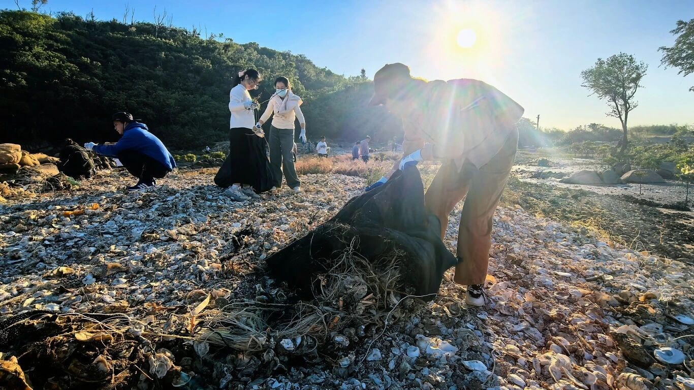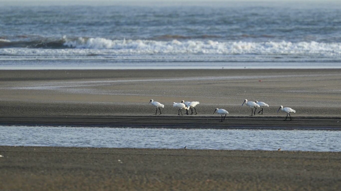 在守護候鳥淨灘活動中,志願者們佩戴防護手套,對鳥類棲息地周邊的垃圾進行地毯式清理,當頑固垃圾被一一拾起,湛藍天空下的潔白候鳥更顯自在靈動。
